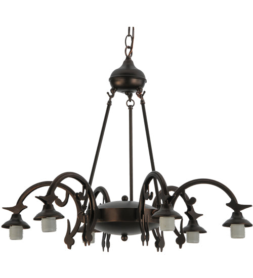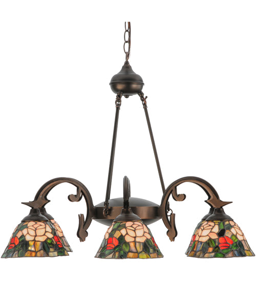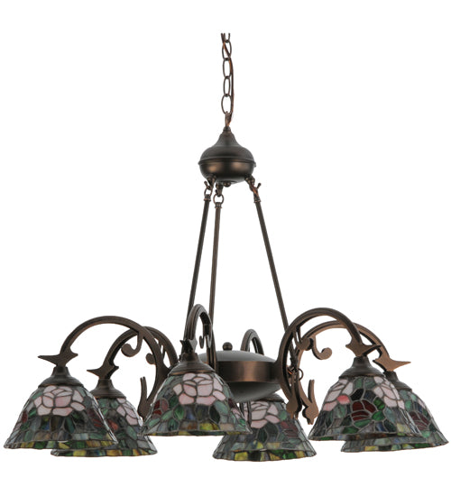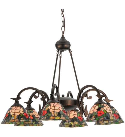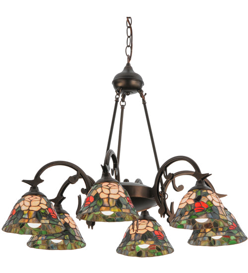 The most beloved of all flowers, the rose, is beautifully represented in this Meyda reproduction of a Tiffany Studio classic. Petal Pink, Romantic Red and Plum Passion art glass roses ramble on a maze of Garden Green leaves. These delicate domed stained glass shades are paired with a graceful, hand-finished Mahogany Bronze six-light chandelier fixture.