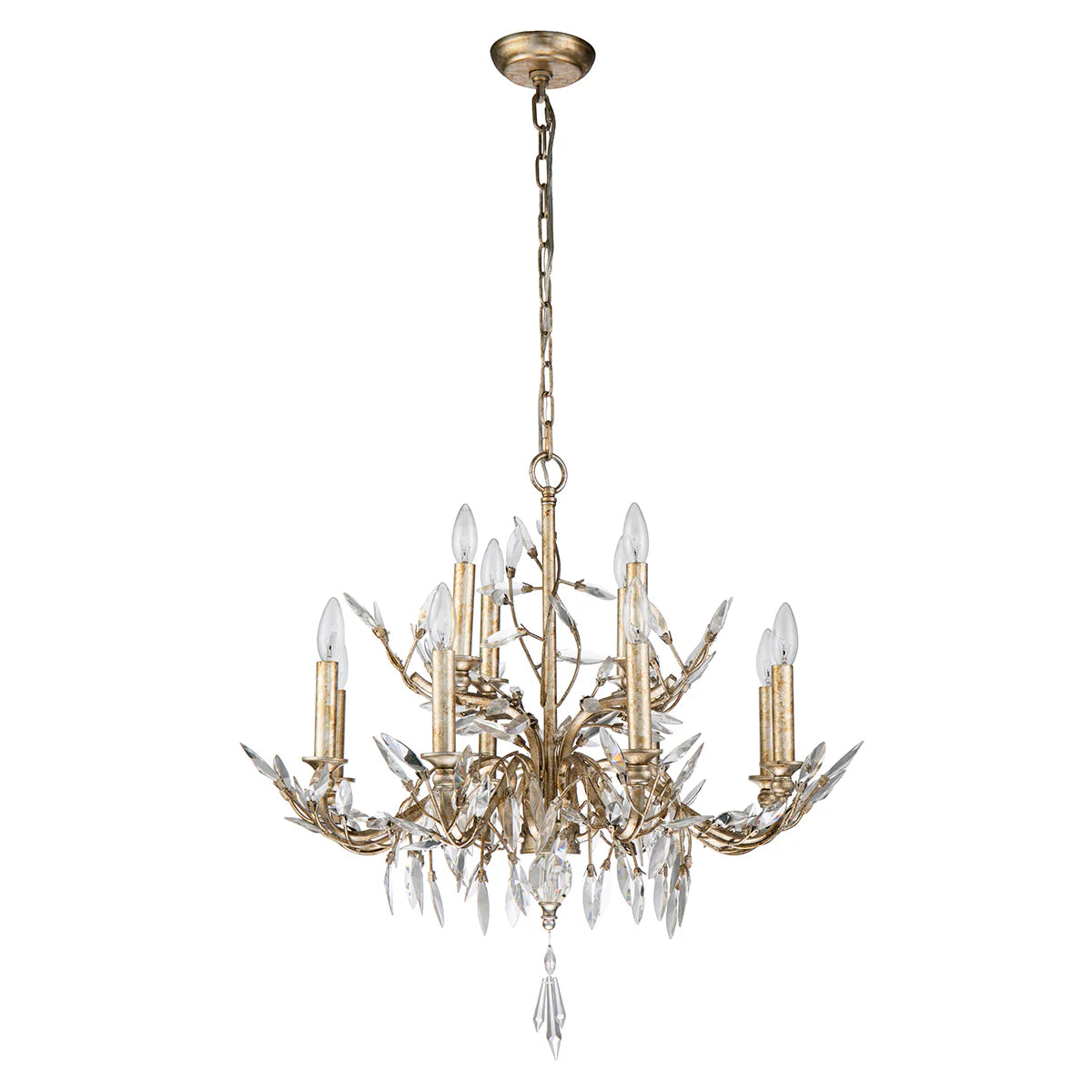 Showing off our love for a traditional shape and a simple silver metallic finish, this elegant crystal chandelier is perfect for a dining room, kitchen or bathroom application. Using the silver with an antique glaze mix, this chandelier's finished metal is formed into a beautifully curved frame that highlights clear hand-cut crystal accents, making this distressed champagne and crystal twelve light chandelier a must-have for your glamorous and sophisticated space.