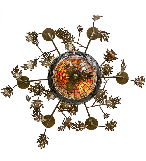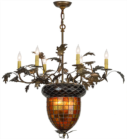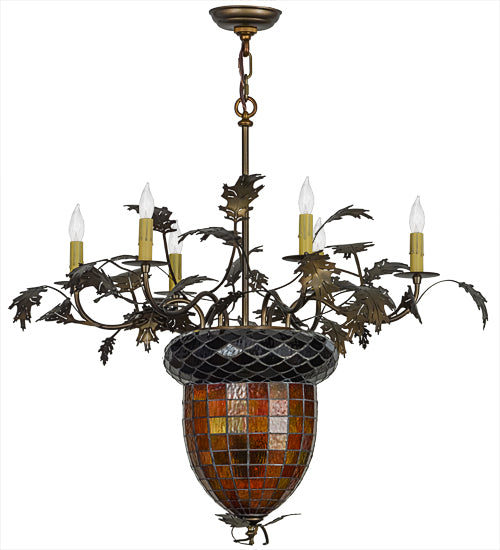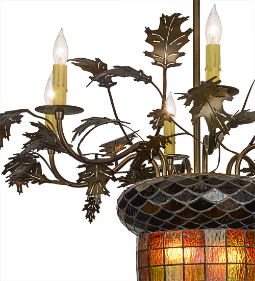 Visually impressive as a mighty Oak Tree, this art glass acorn shade delights with multi-toned Autumn Green and a Bark Brown granite glass crown sprouting oak leaf and acorn hardware finished in Antique Copper. Six faux candlelights on bobeches sprout from branch-like arms.
