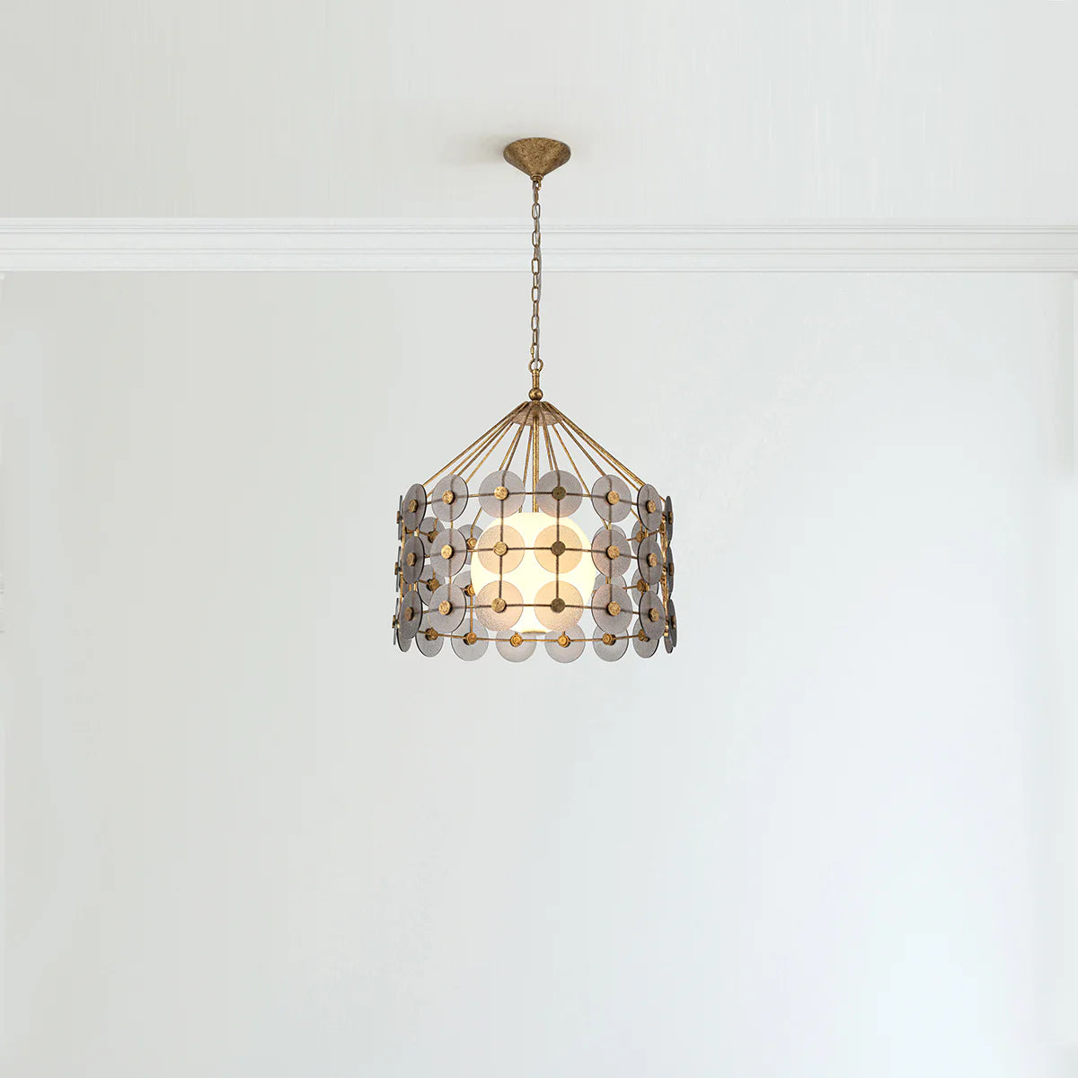 The body has an antiqued gold leaf finish with dark grey textured glass discs that are highlighted by a light grey tone when lit. The discs have a dark grey appearance when not illuminated. This two-tier pendant chandelier features an adjustable height and gold smokey glass for a versatile and elegant design.