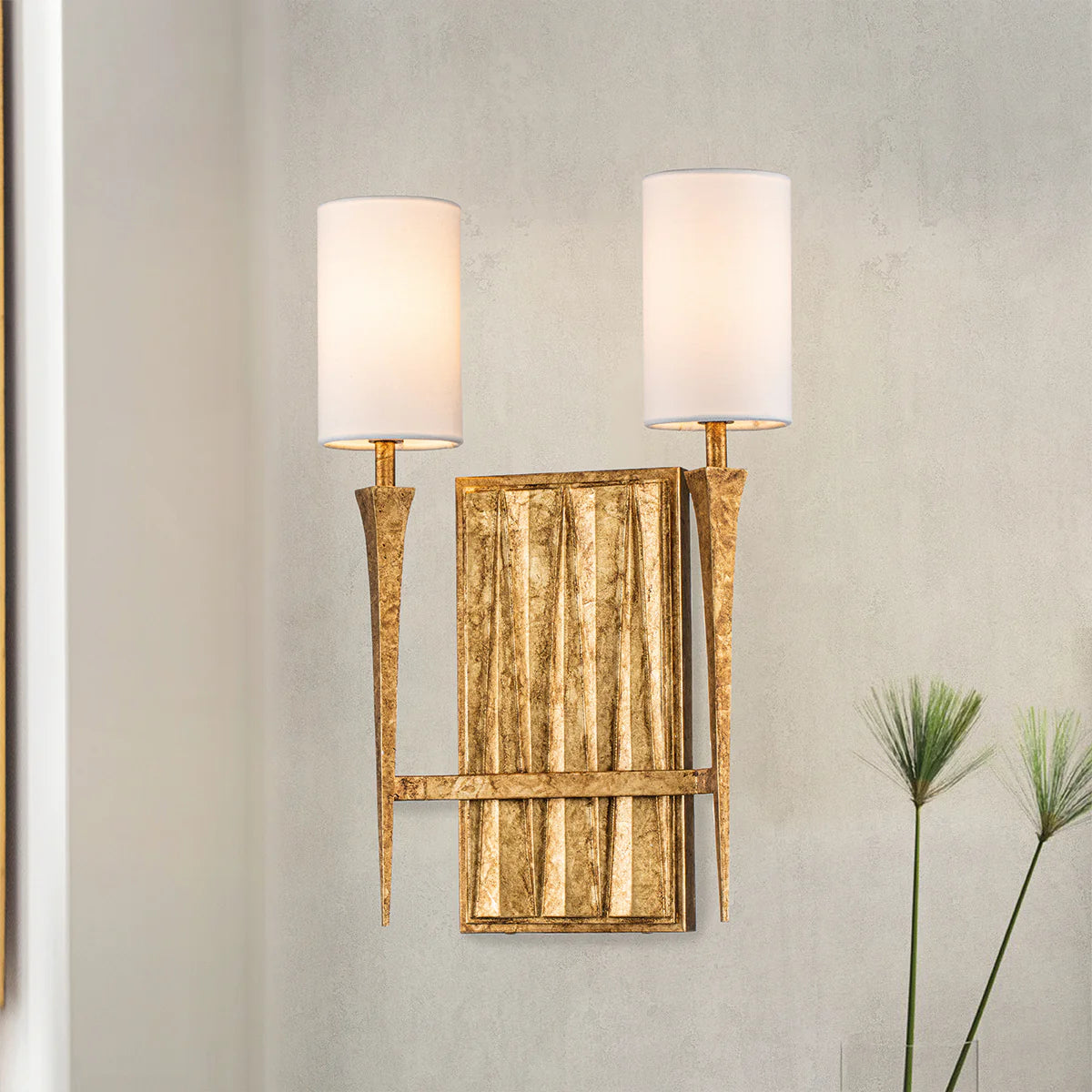 The cream linen shades gently diffuse light, while the bold, linear design commands attention. The Gold Leaf accents add a touch of glamour, and the fixture is ADA Compliant. With two lights and a linen shade, this wall sconce is both functional and stylish.