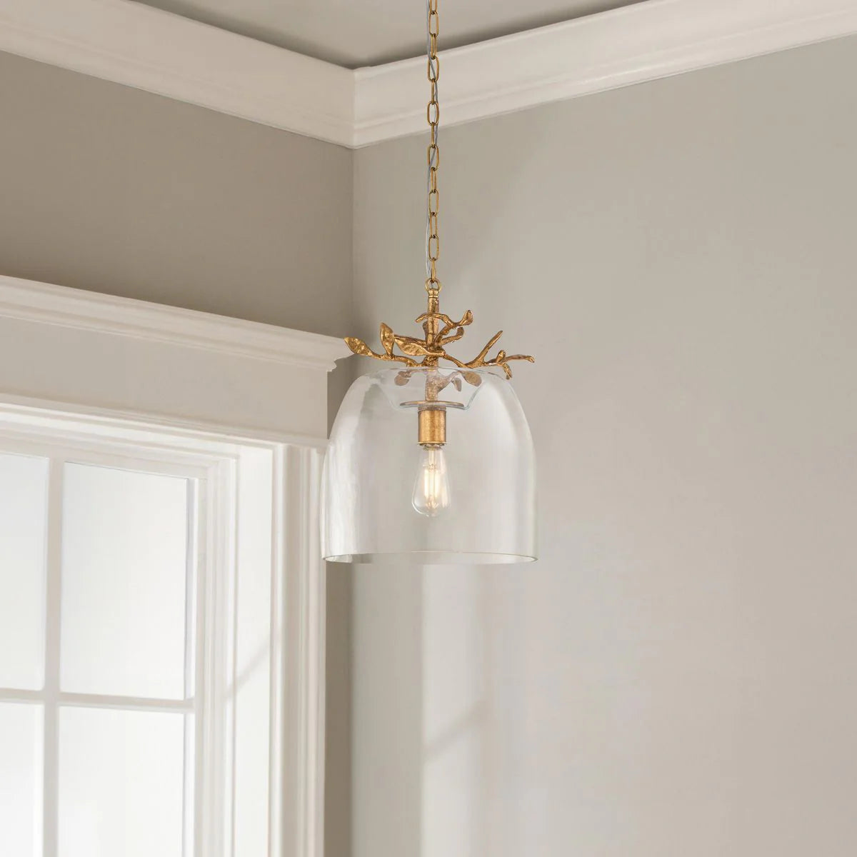 The Audubon Park 14" Pendant Chandelier ceiling light by Lucas McKearn features a delicately curved glass shade adorned with gilded branches, bringing a stunning organic touch to any space.