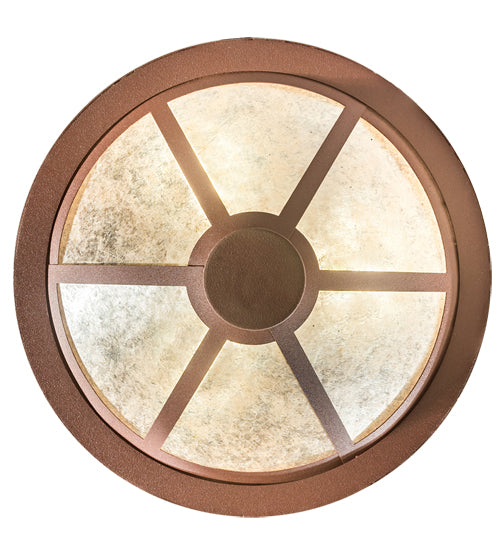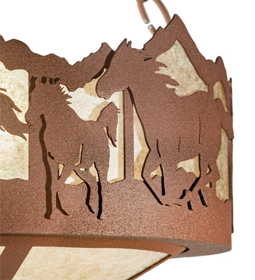 Wild Horses gallop across the mountainside as the warm morning sun rises in the background. Beautiful ambient lighting is projected through a stunning Silver Mica lens and bottom diffuser while the hardware is featured in a Rust finish.