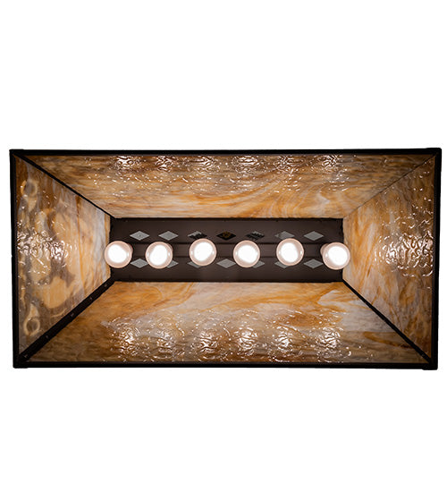 This pendant chandelier lighting fixture is made of steel and glass. The steel components are finished in Oil Rubbed Bronze. The lens is Beige Art Glass. This fixture has a UL rating for damp locations.