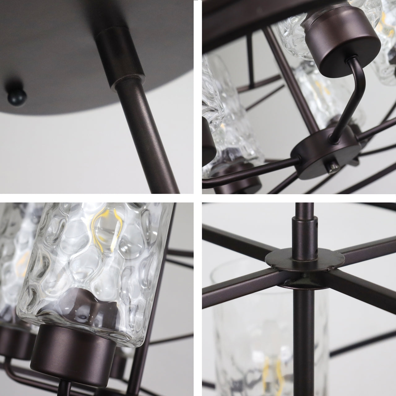 The metal frame is in an oil rubbed bronze finish. This ceiling light fixture takes four 60W E12 bulbs and is compatible with incandescent, fluorescent, and LED bulbs. This fixture is dry-listed and UL-listed, and not recommended for damp/wet locations. Recommended for residential and commercial use.