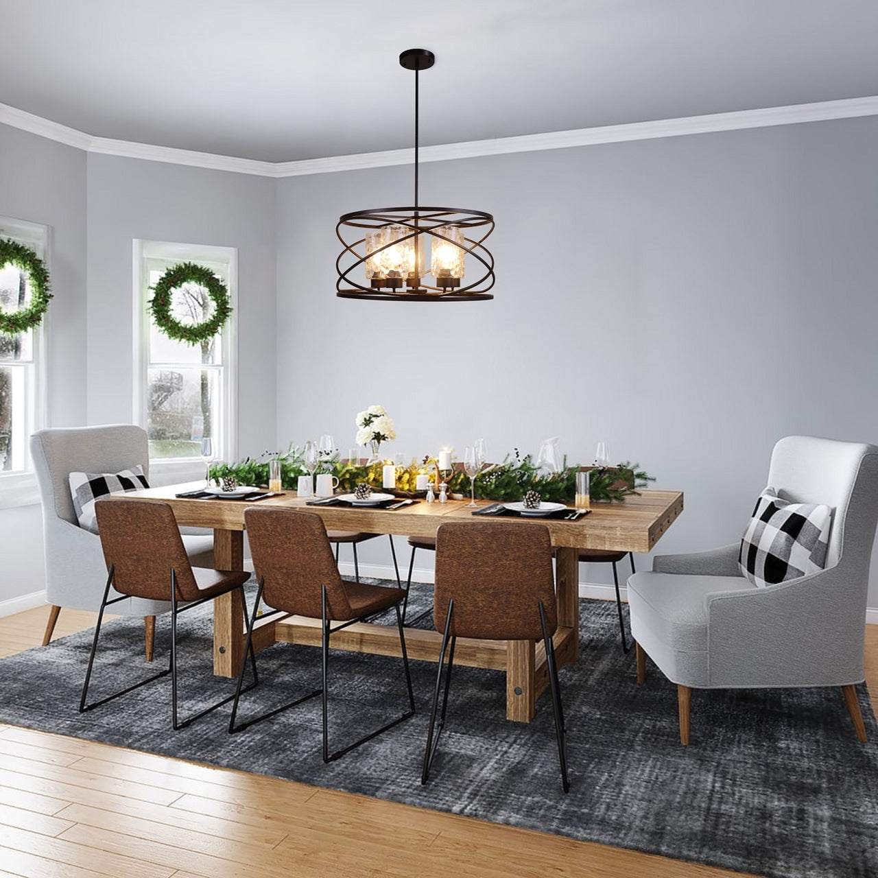 This is a sleek drum design 5 light, industrial-style hanging pendant chandelier ceiling light that would be a perfect fit over a bar area, over a dining table, living area and in the hallway!