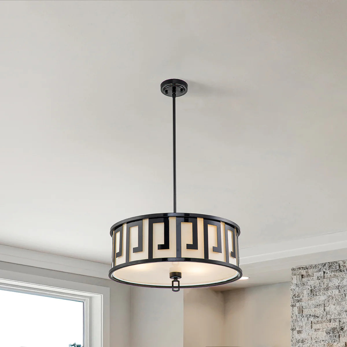 Our Flambeau-inspired kitchen pendant is designed with a classic Greek key-like metal outer drum with an ivory linen inner shade made into a hanging adjustable pendant creating a striking focal point. In the black finish, it is the perfect addition to your bedroom, kitchen, or over your bar.