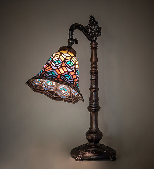 Experience the exquisite beauty and craftsmanship of the 20" High Tiffany Peacock Feather Bridge Arm Table Lamp by Meyda. Inspired by one of Tiffany's most beloved designs, this stunning lamp features a shade adorned with mauve, beige, pink, orange, and gray art glass, as well as feathers in vibrant turquoise, blue, and purple hues.