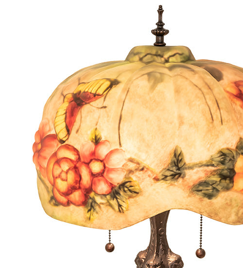Reminiscent of antique lighting that graced the homes and apartment buildings of the early 20th century. This table lamp features a Puffy style art glass shade that evokes a warm nostalgic feeling of enduring quality and beauty. The Beige Satin shade features an embossed design with Red and Orange Flowers & Butterflies, with Green Leaves.