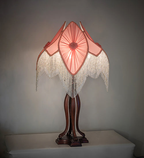 Pink pleated fabric with floral accents is edged with Ivory Glass Hand-beaded trim. This Victorian-inspired, intricately detailed shade is enhanced with an elegant cast metal base finished in Mahogany Bronze. A versatile table lamp to complement nearly any interior colour or style, this lighted accent piece is ideal for placement on a living room end table, dining room credenza, or bedroom nightstand.