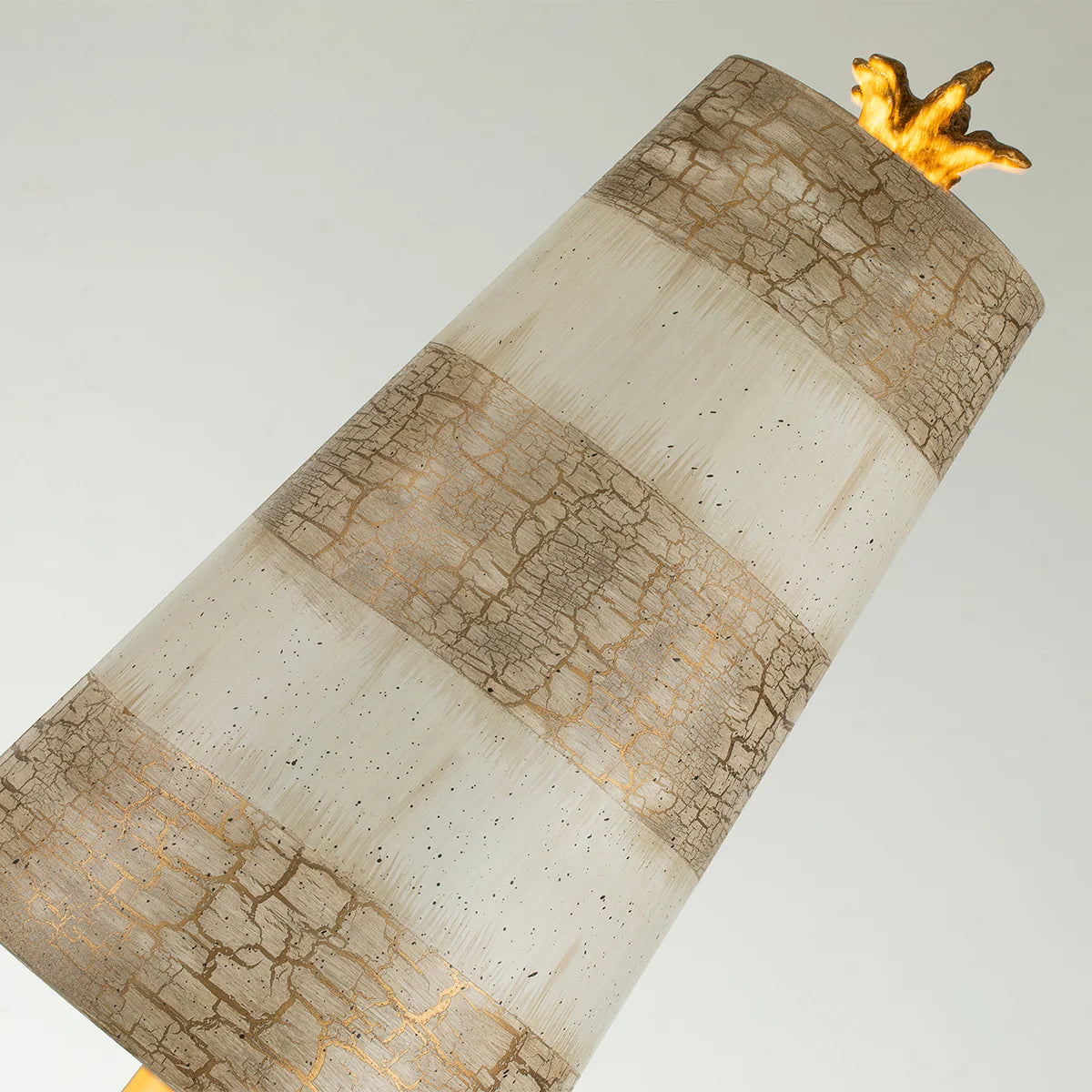 - Crackled gold leaf and cream stripes detail the shade above a mélange of narrowing striped stems. Crystal accents on a two-tier star shaped base.