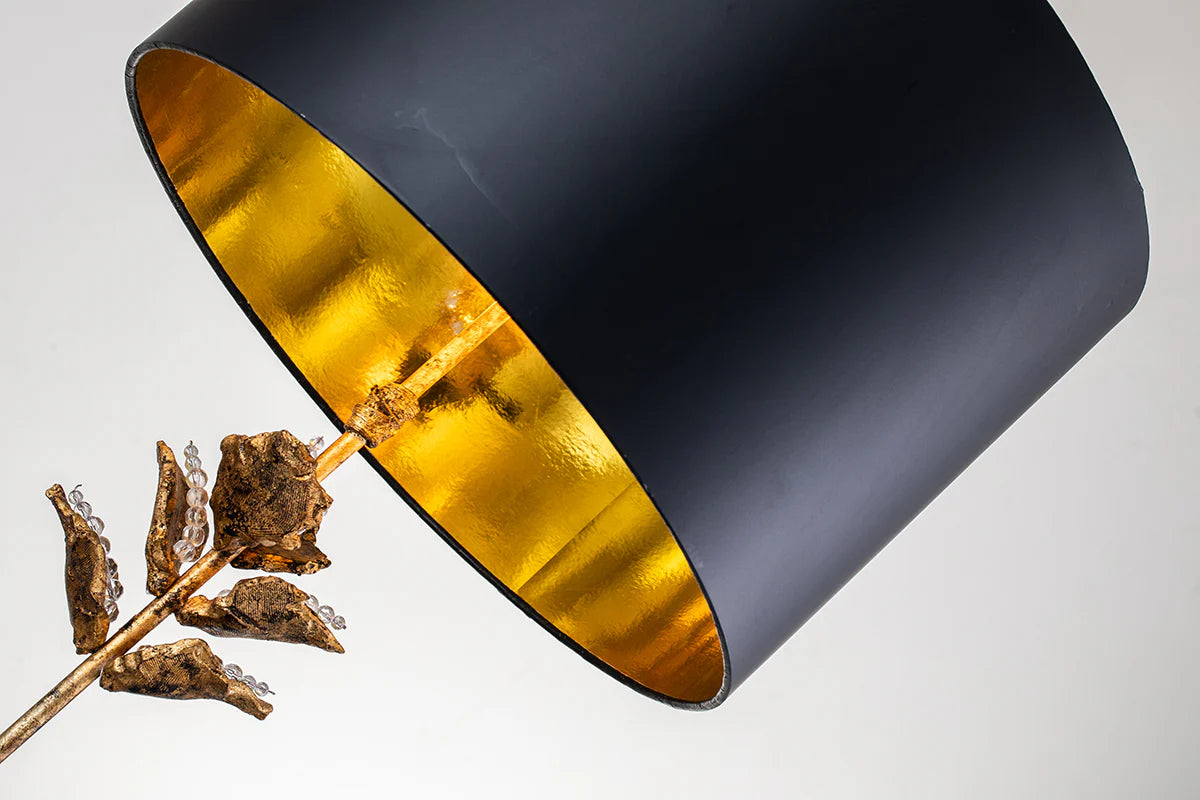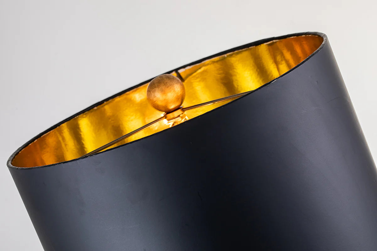 Experience the perfect combination of style and utility with the Camilia Table Lamp. Its black drum shade and hand-sculpted black base with gold leaf inside the shade perfectly blend tradition and modernity, adding an element of elegance to any room. A must-have for those with a passion for beautifully designed home decor, this lamp will elevate any space with its sleek and sophisticated aesthetic. Perfect for the bedroom or living room, let this lamp bring a touch of simplicity and style to your home.