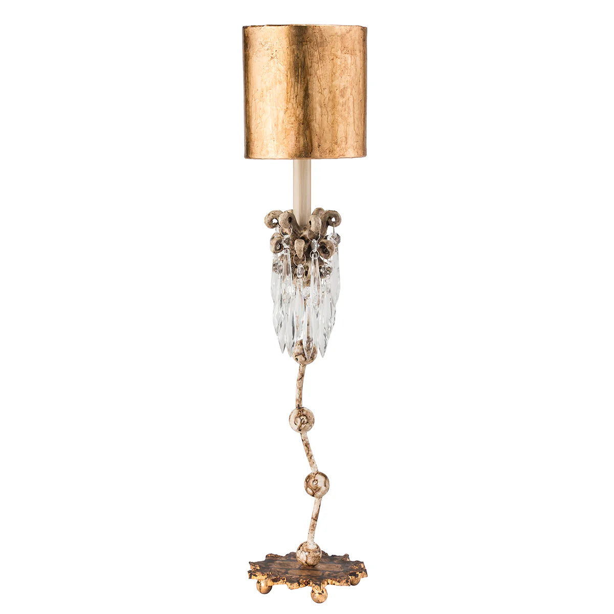 - A distressed gold leaf base forms the foundation of a slithering steam topped with gold sculpted decorative elements and crystals.