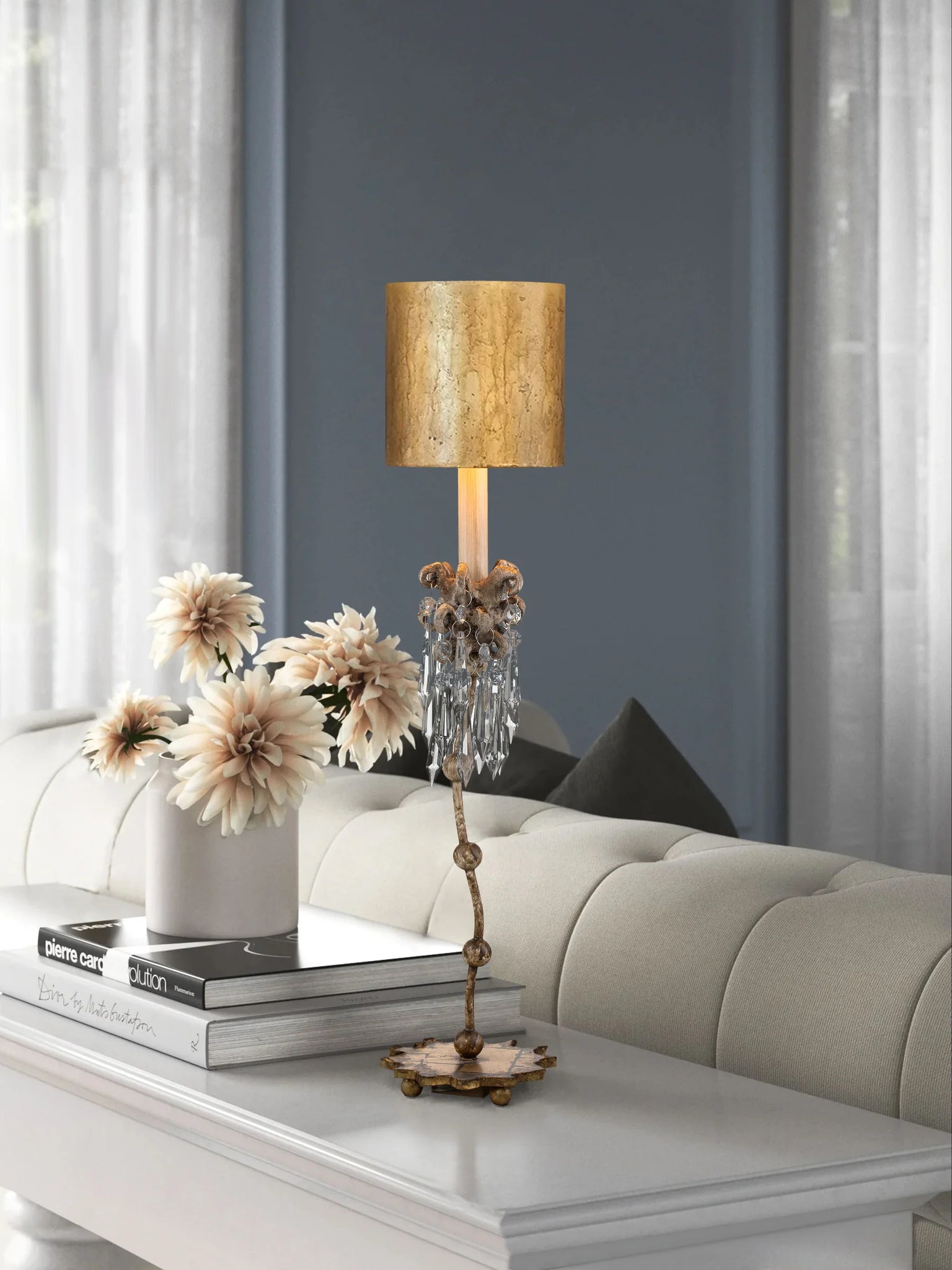Create an elegant and practical atmosphere with this Venetian Table Lamp Bedside Nightstand Reading Desk Table Light. This versatile light source offers a warm and sophisticated ambiance, as well as optimal reading light for your bedside or desk. My studio windows provide a tranquil view of trees, stripped of their leaves but adorned with beautiful, twisted branches.